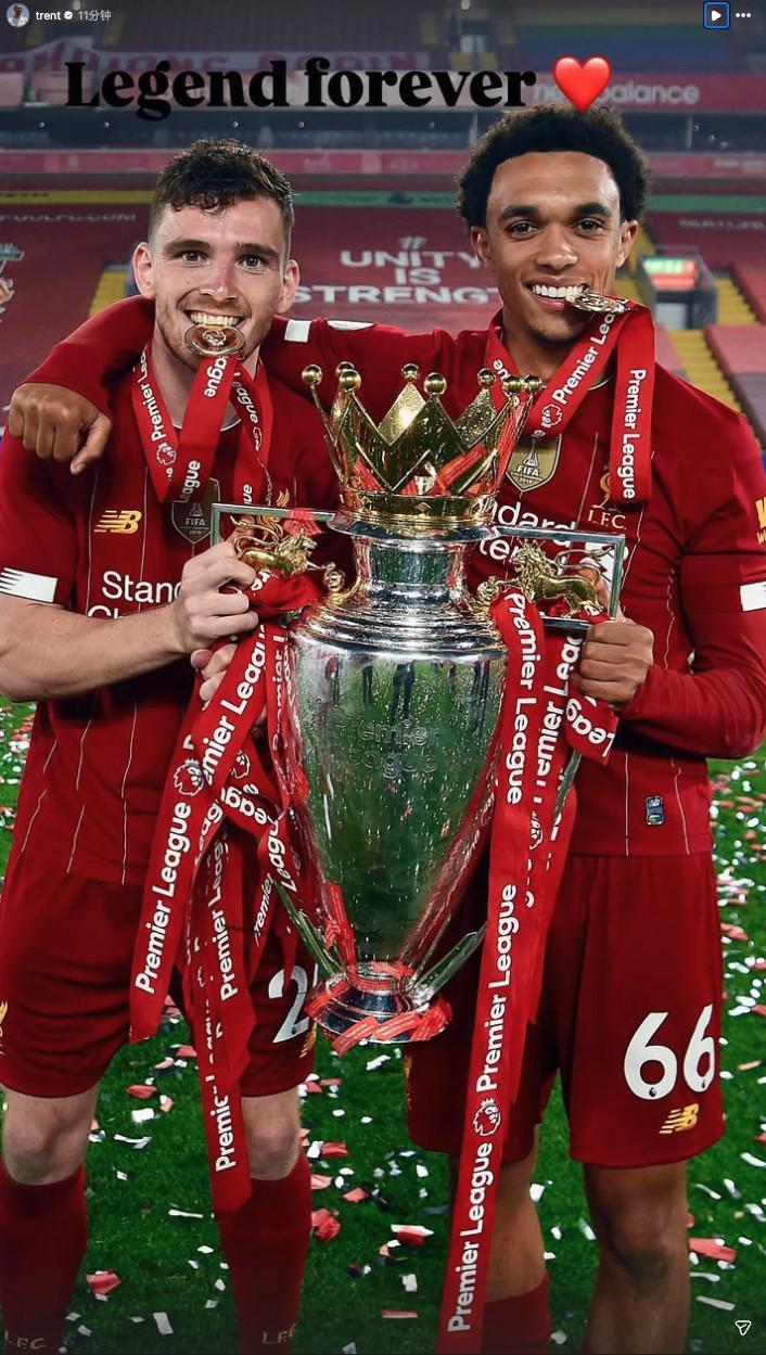 尽管阿诺德在去年夏天已经离开了利物浦,但他对前队友罗伯逊的敬意丝毫未减。在社交媒体上,阿诺德晒出了一张与罗伯逊在2019-20赛季共同手捧英超冠军奖杯的合照,并深情配文:“永远的传奇❤️”。这张照片不仅记录了两人共同奋斗的辉煌时刻,也见证了他们之间深厚的友谊。