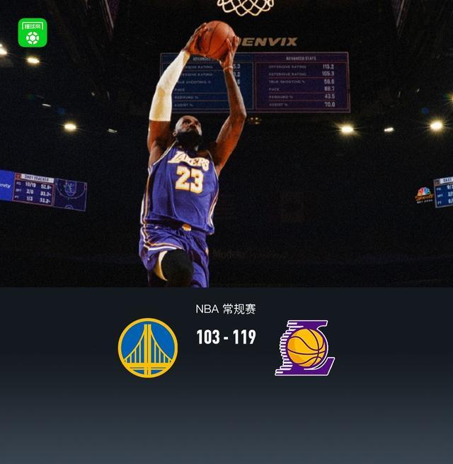 湖人119-103大胜勇士,詹姆斯26+8+11全面发挥,库里缺阵成关键