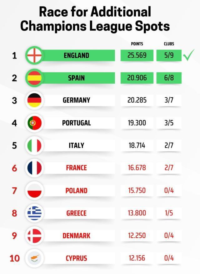 根据本赛季的欧战规则,成绩最为出色的两个联赛将各自获得一个下赛季的欧冠名额。在本周阿森纳击败里斯本竞技之后,英超已经提前锁定了一个名额。而剩下的一个名额,则主要由西甲和德甲来竞争。目前,西甲仍然以一定的优势领先于德甲,并且暂时有6支球队仍在欧战赛场上奋战。然而,本轮过后,皇马、巴萨和塞尔塔等队都面临着较大的出局风险。相比之下,德甲在三级欧战中各剩下一支球队,拜仁、弗赖堡和美因茨的晋级前景则相对乐观。