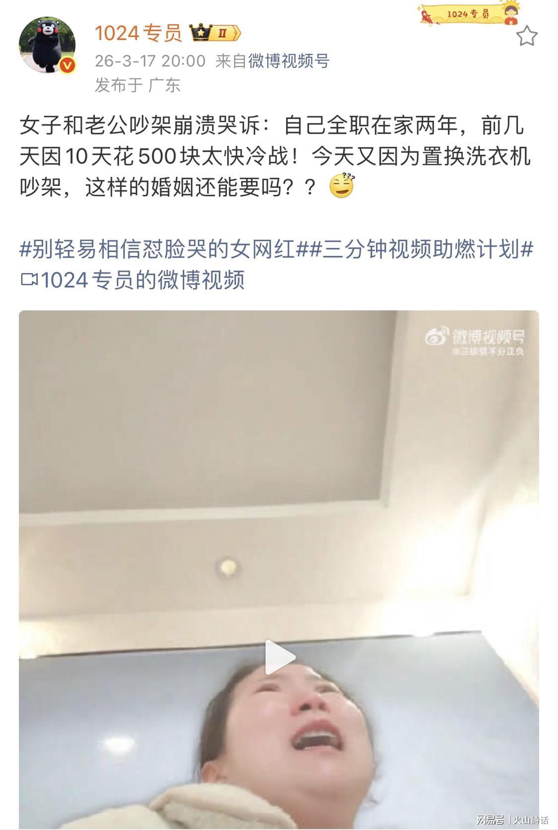 - 这名全职太太的哭诉,无疑戳中了无数人的心。她在家全职两年,无微不至地照顾着家庭,却因为10天花500元而被丈夫指责花钱太快,进而陷入冷战。又因为想要置换洗衣机,两人再次发生争执,让她崩溃发问:“这样的婚姻还能要吗?”这句话背后,隐藏着无数全职主妇不被理解和尊重的无奈与心酸。