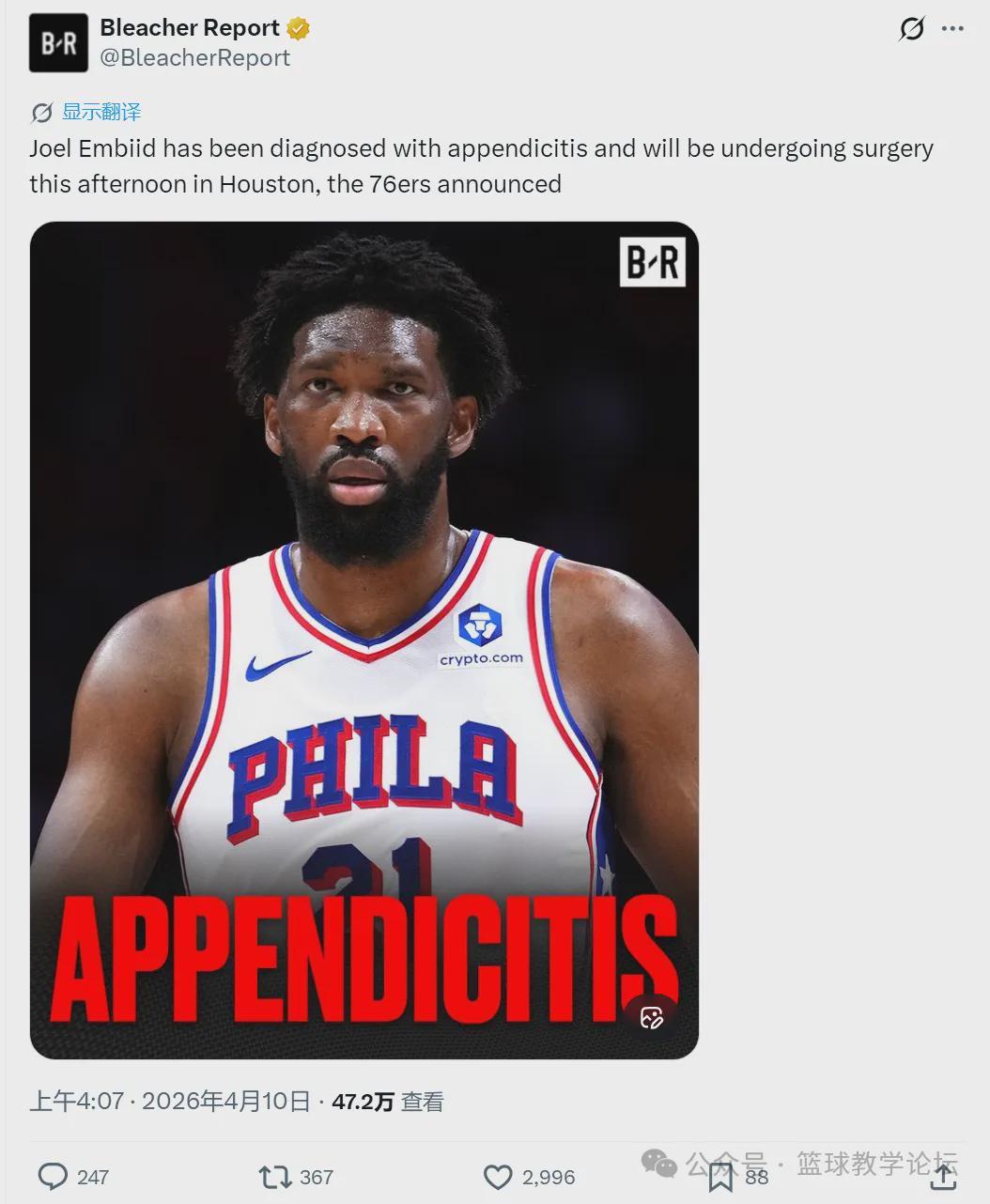北京时间4月10日消息,费城76人队在客场挑战休斯顿火箭队的赛前发布重磅公告:当家球星乔尔·恩比德已在休斯顿当地医疗机构完成阑尾炎切除手术,本赛季常规赛征程提前终结。据运动医学专家Jeff Stotts分析,NBA球员接受阑尾切除术后的平均缺阵周期为23天,这意味着恩比德最早要到5月中旬才能重返赛场。