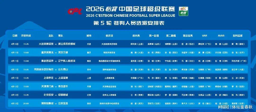北京时间4月10日,中国足协正式对外公布了第5轮中超联赛的裁判选派详情。本轮赛事中,有两场焦点对决格外引人注目,一场是11日在上海体育场激情上演的上海滩德比大战,另一场则是12日北京国安在工体迎战成都蓉城的强强对话。这两场比赛,向来都是火药味十足,上海德比是同城球队的激烈碰撞,而国安与成都蓉城之战,则是榜首球队与急需抢分球队的正面交锋,究竟由哪位裁判来执法,无疑成为了赛前备受关注的敏感话题。