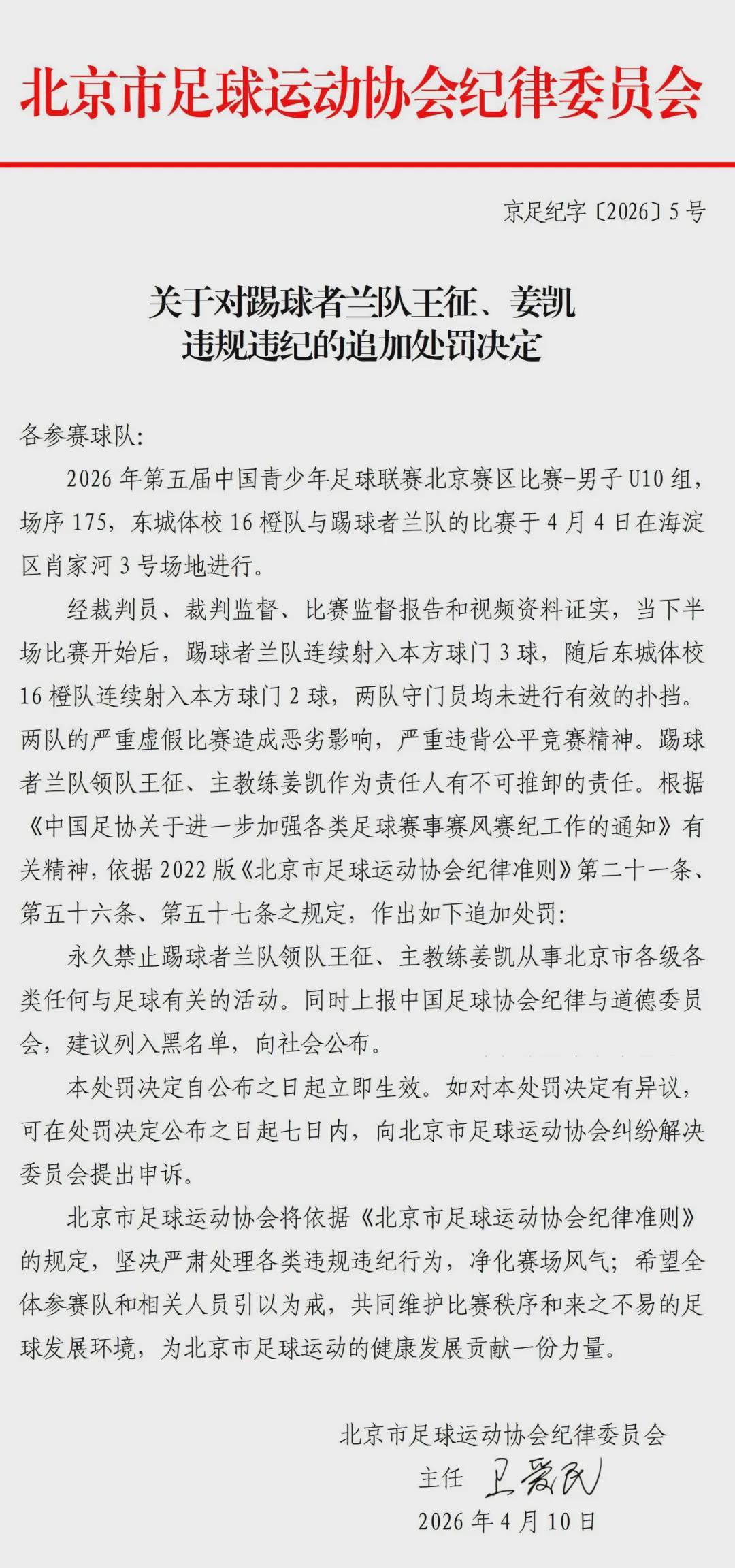 针对这一严重违反体育道德和竞赛规则的事件,北京市足球运动协会纪律委员会迅速介入调查,并于当日发布了关于对涉事球员的追加处罚决定。其中,踢球者兰队的王征、姜凯因违规违纪行为受到严厉惩处;同时,东城体校16橙队的于洋、崔宇也因同样原因被追加处罚。这一系列举措彰显了足协对于维护比赛公平公正、打击假赛行为的坚定决心。