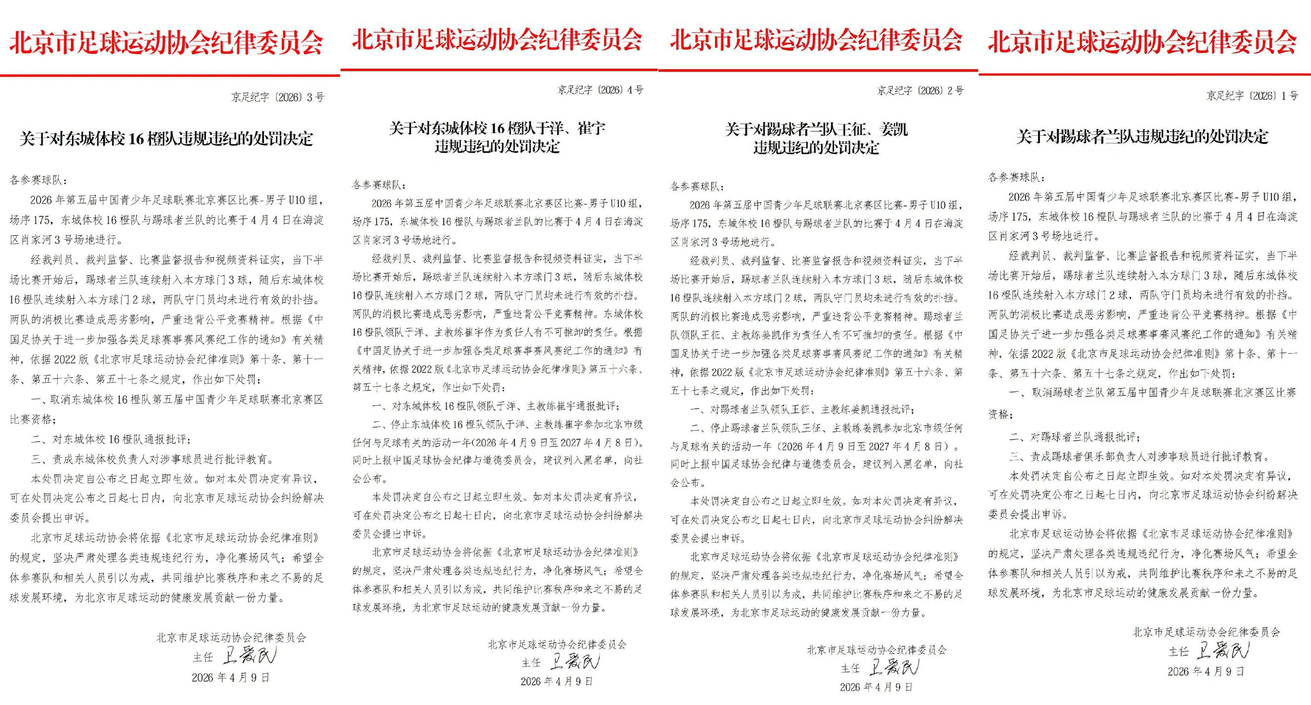 在一场U10的足球对决中,比分定格在3比3,然而令人咋舌的是,这六个进球竟然全部是乌龙球!面对如此荒诞的赛场乱象,北京市足协果断出手,对涉事双方——踢球者兰队与东城体校橙队,开出了严厉的罚单:两队比赛资格被剥夺,双方领队及主教练均被禁赛一年,以儆效尤。