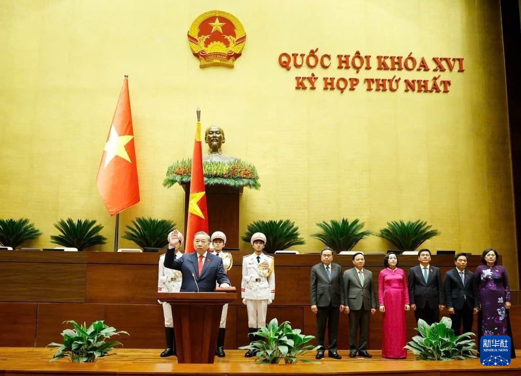 4月7日,在越南首都河内,苏林宣誓就任越南国家主席,现场画面通过新华社与越通社向全球传播