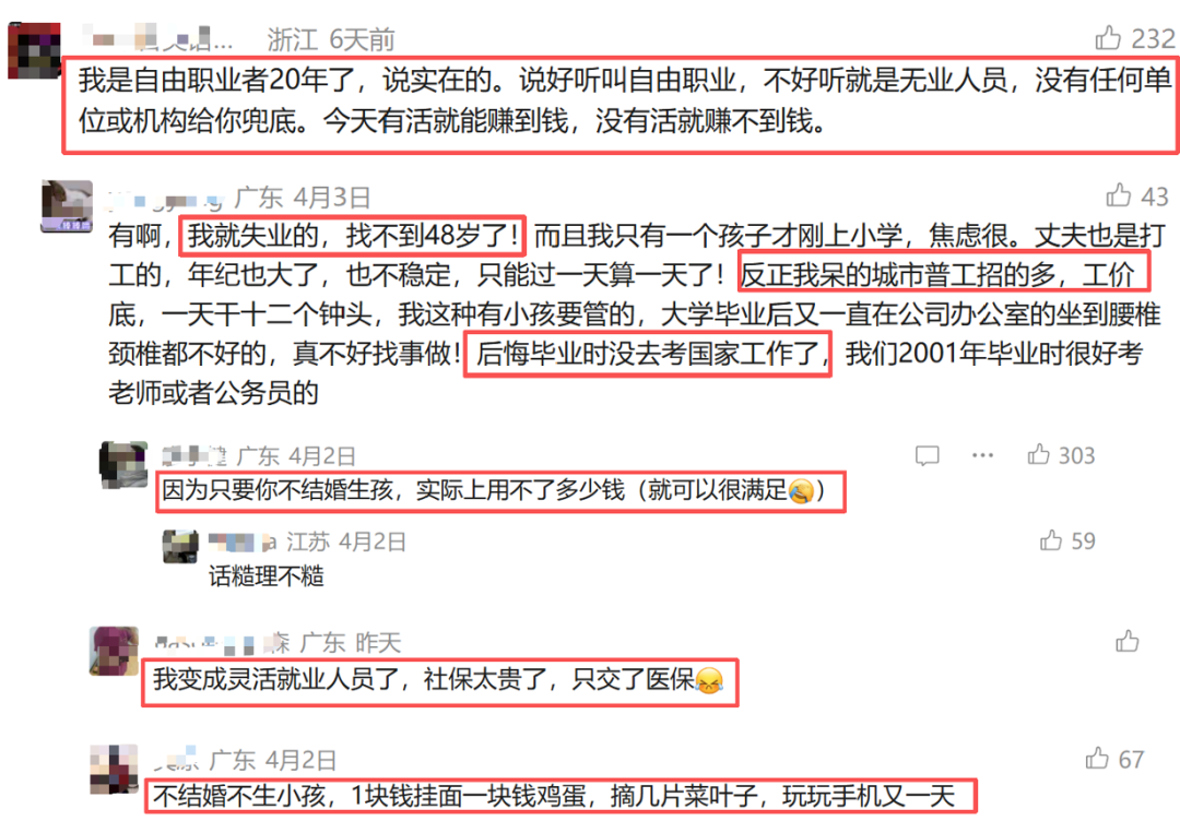 而广东的一位网友则分享道,自己48岁失业后,难以找到合适的工作,孩子刚上小学,为了生计,不得不在城市里做普工,每天工作12小时,不禁后悔当初毕业时没有选择考公务员;