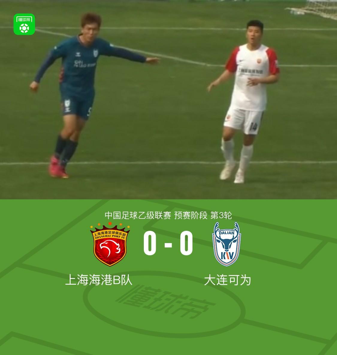 北京时间4月10日,中国足球乙级联赛预赛阶段第3轮迎来一场焦点对决,上海海港B队坐镇主场迎战大连可为。经过90分钟的激烈角逐,双方均未能攻破对方球门,最终以0-0的比分握手言和。