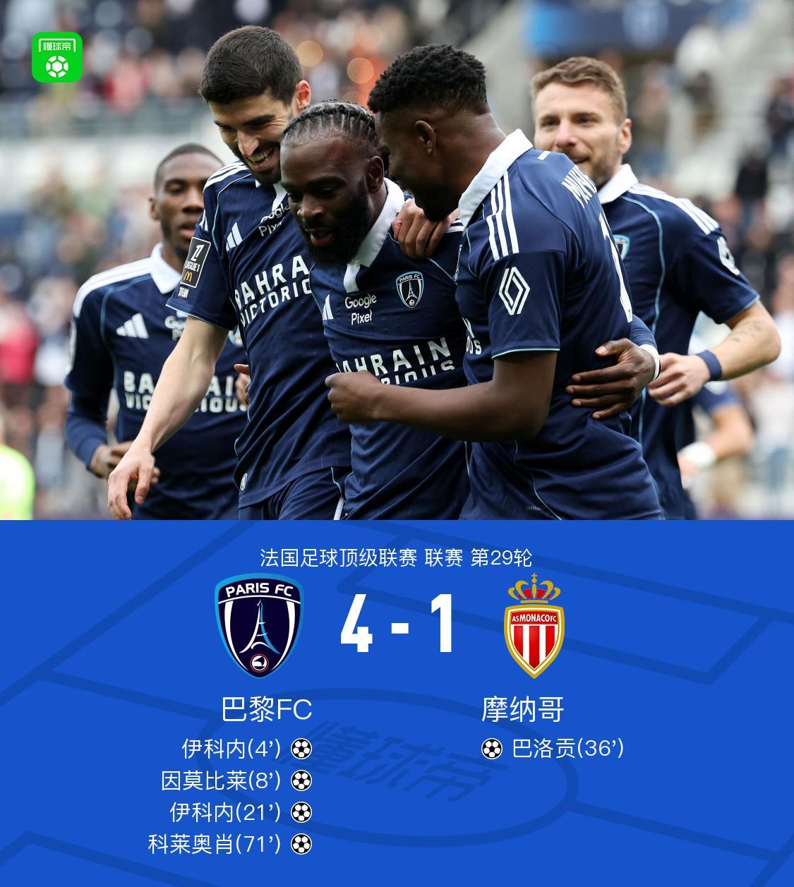巴黎FC 4-1大胜摩纳哥,伊科内双响闪耀全场,因莫比莱建功