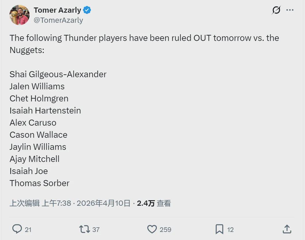 北京时间4月10日,雷霆队官方正式对外公布了球队最新的伤病情况报告。在即将到来的与掘金队的对决中,雷霆队将有多达10名球员无法出战:亚历山大因斜肌伤势高挂免战牌,杰伦 - 威廉姆斯腿筋受伤,霍姆格伦背伤未愈,哈滕比目鱼肌有状况,卡鲁索选择轮休,卡森 - 华莱士脚趾不适,杰林 - 威廉姆斯跟腱炎发作,阿杰伊 - 米切尔脚踝有伤,以赛亚 - 乔膝部酸痛,索伯则是遭遇了ACL伤病。