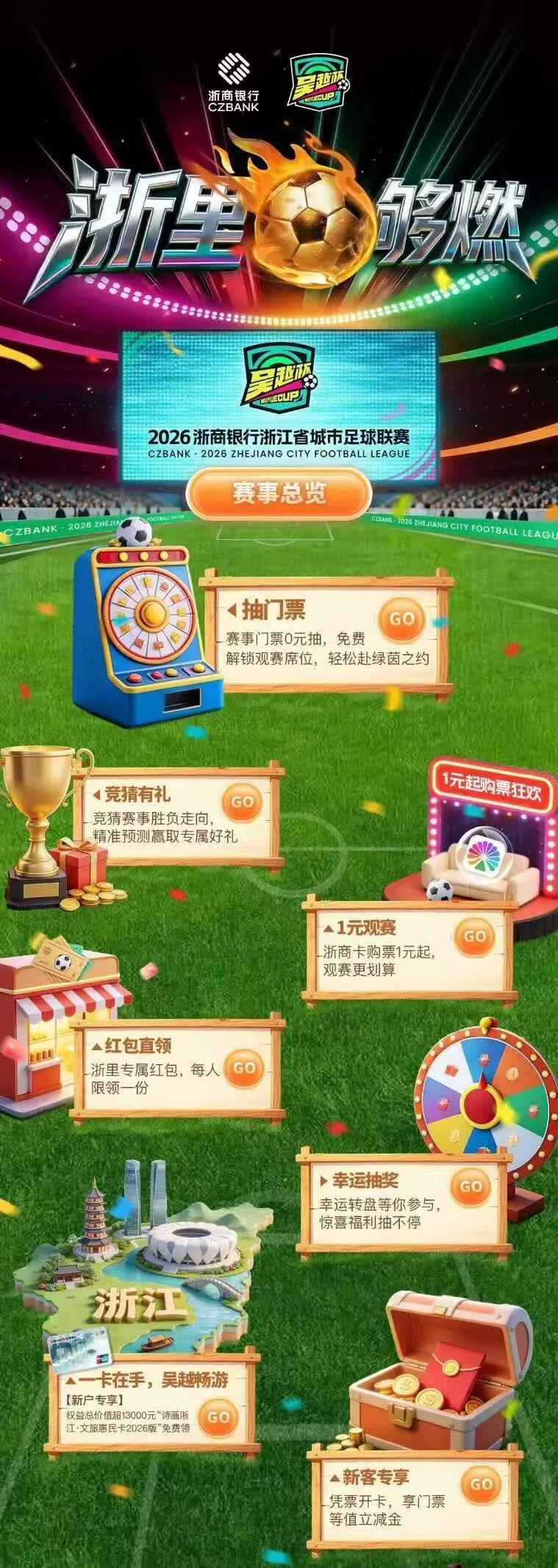 当然,福利远不止于此。市民们还可以在现场申请“浙商银行·诗画浙江文旅联名信用卡”,新客户激活首刷即可领取新户礼“文旅惠民卡2026版”,这张卡片包含了免费权益总价值超过13,000元的丰富福利。同时,月消费满10笔的持卡人还可以享受支付宝/微信渠道1%的消费返现,月奖励上限高达100元微信立减金(分期达标更可提高至200元),让市民们在享受足球盛宴的同时,也能享受到实实在在的金融优惠。