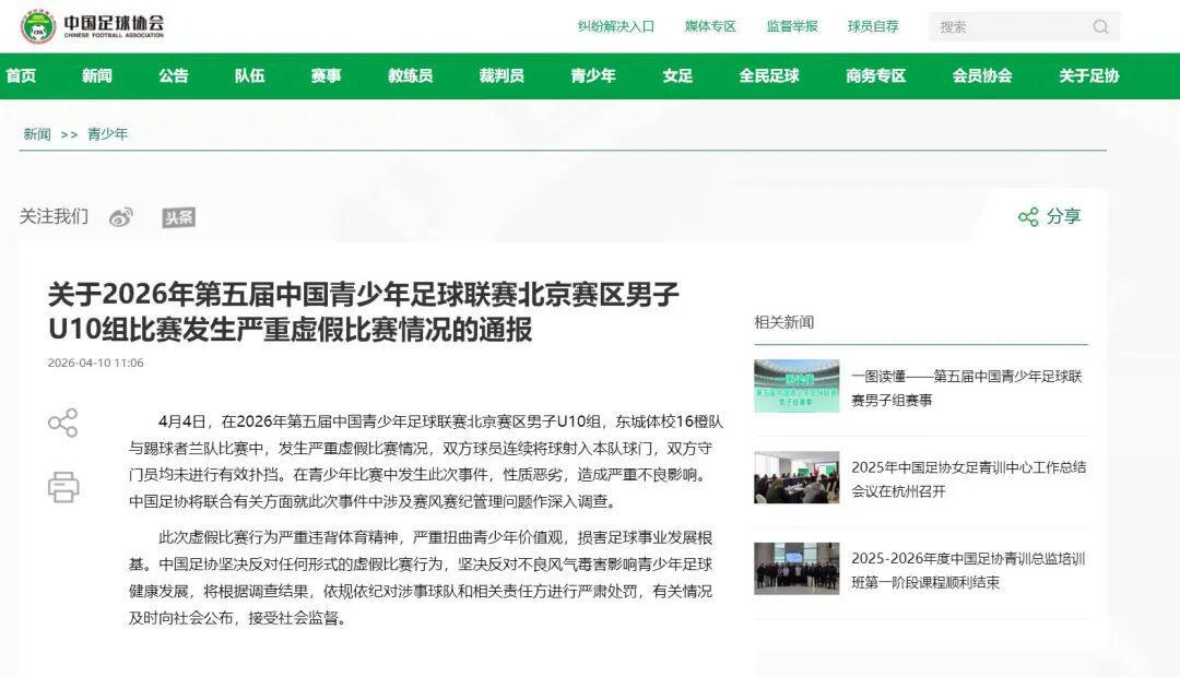通报指出,4月4日在2026年第五届中国青少年足球联赛北京赛区男子U10组别的一场比赛中,东城体校16橙队与踢球者兰队之间发生了严重的虚假比赛情况,双方球员竟然连续将球射入本队球门,而双方守门员也均未做出任何有效的扑挡动作。在青少年足球比赛中发生如此事件,性质之恶劣、影响之深远,令人痛心疾首。中国足协将联合相关部门,就此次事件中涉及的赛风赛纪管理问题进行深入调查。