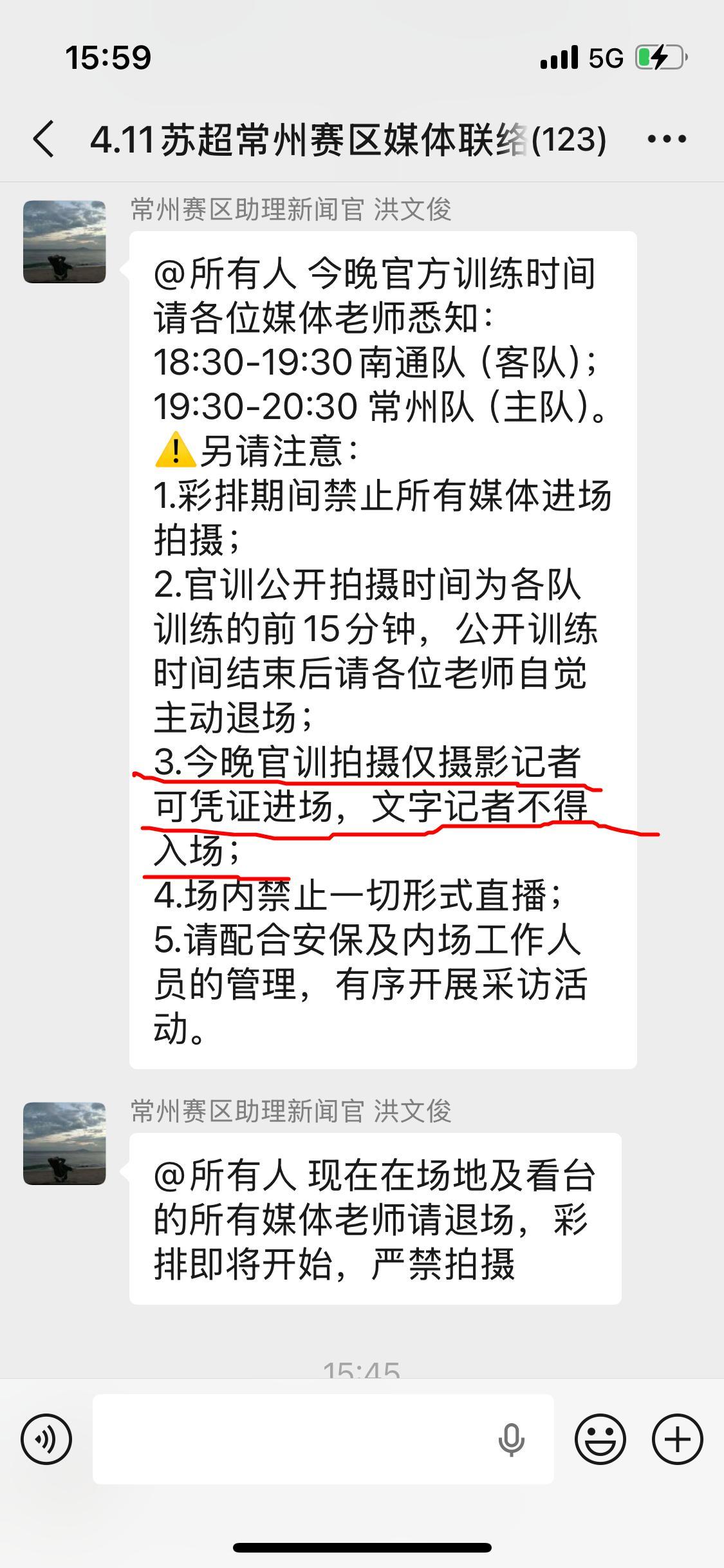 常州赛区助理新闻官洪文俊在媒体群中发布了一则群通知,明确指出不允许记者拍摄明晚的开幕式彩排。同时,对于今晚两队的赛前官方训练,虽然允许摄影记者入场拍摄,但却将文字记者拒之门外。