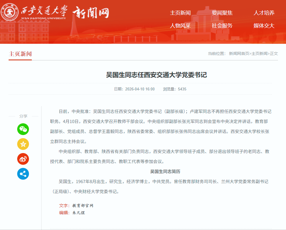 4月10日,西安交通大学迎来了一场重要的教师干部会议,会上中央组织部副部长张光军郑重宣布,吴国生正式出任西安交通大学党委书记,级别为副部长级,而卢建军则卸下了这一重任。初看之下,这一人事变动似乎并无特别之处,但深入探究吴国生的履历,你会发现其中蕴含着不少引人深思的细节。这位新上任的书记,其职业生涯几乎都与财务紧密相连。