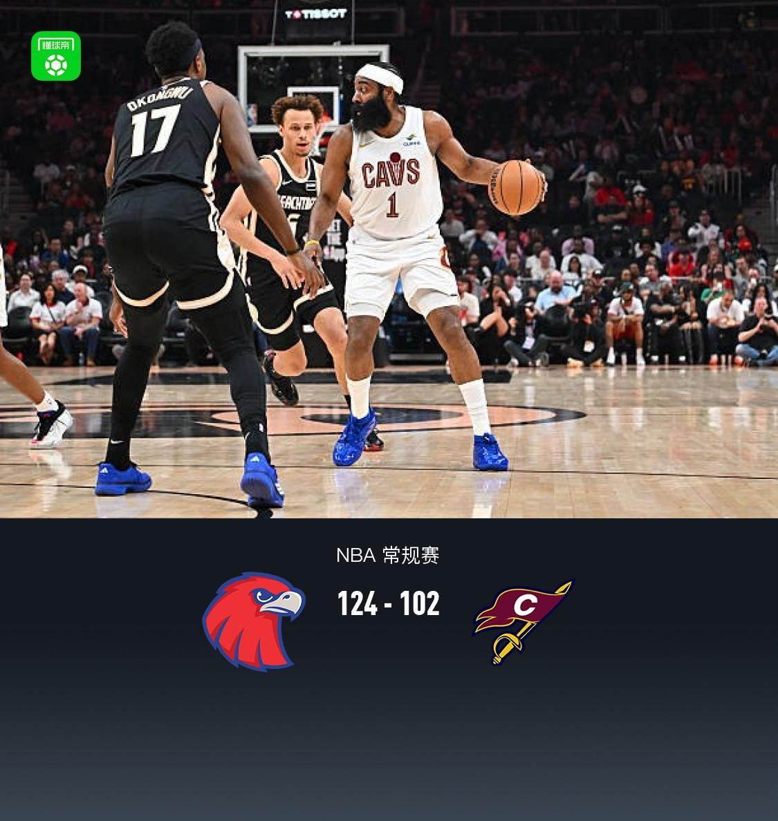 老鹰124-102大胜骑士,CJ-麦科勒姆29分领衔,哈登难救主