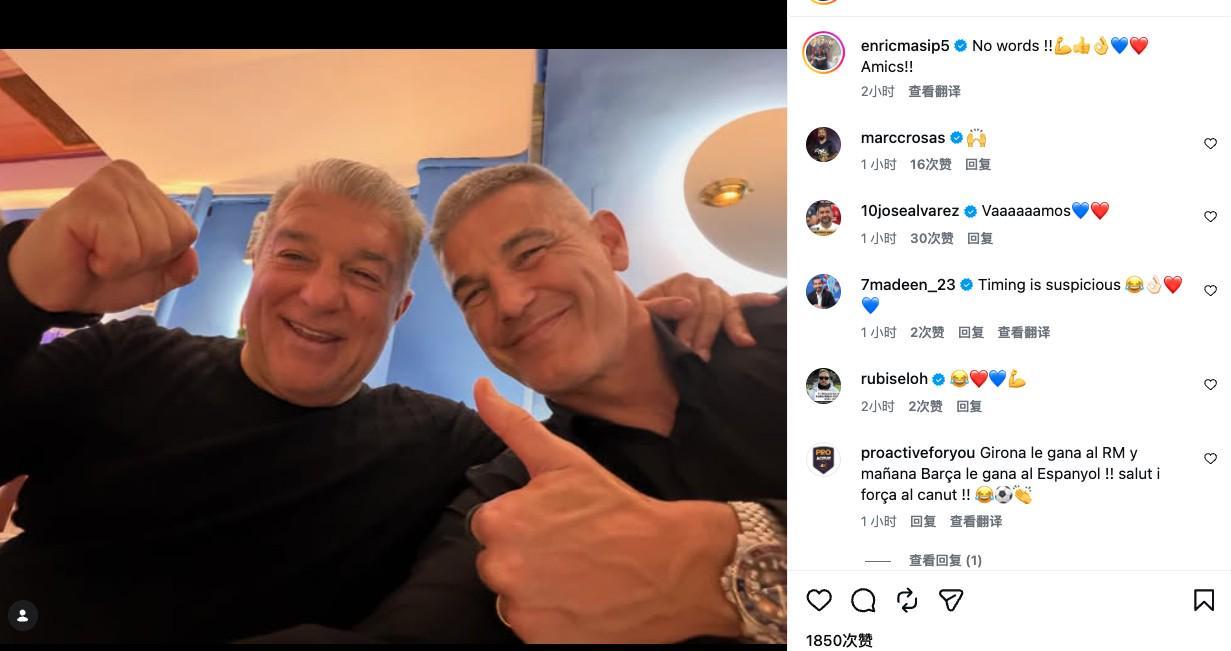 作为拉波尔塔身边的智囊团成员,恩里克-马西普在赛后第一时间晒出了与拉波尔塔的亲密合影。照片中,两人笑容满面,一边竖起大拇指表达满意,一边握拳高举,仿佛在提前庆祝巴萨的夺冠之路。这样的庆祝姿势,无疑是对皇马平局结果的一种间接回应。
