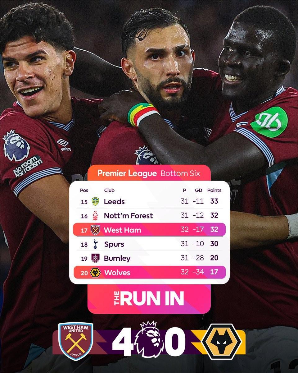 在英超第32轮率先展开的一场对决中,西汉姆联坐镇主场,以一场酣畅淋漓的4-0大胜狼队,成功在积分榜上攀升至第17位,从而暂时摆脱了降级区的困扰。这一结果,无疑给热刺队带来了沉重的打击,因为这是他们自2009年以来,首次在联赛进行了至少三轮之后,不幸跌入降级区。