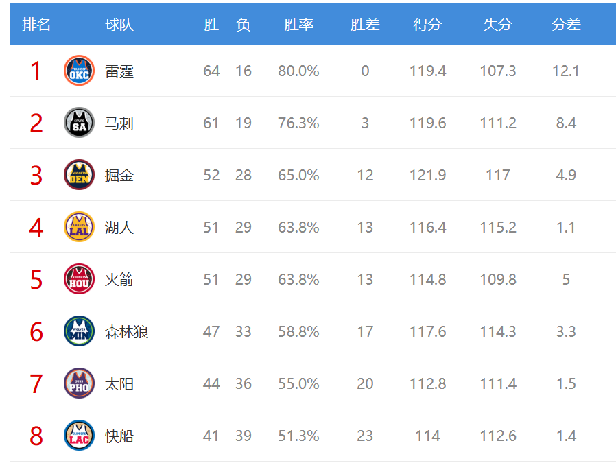 相比之下,湖人、掘金和火箭之间的排名争夺则显得更为复杂和微妙。