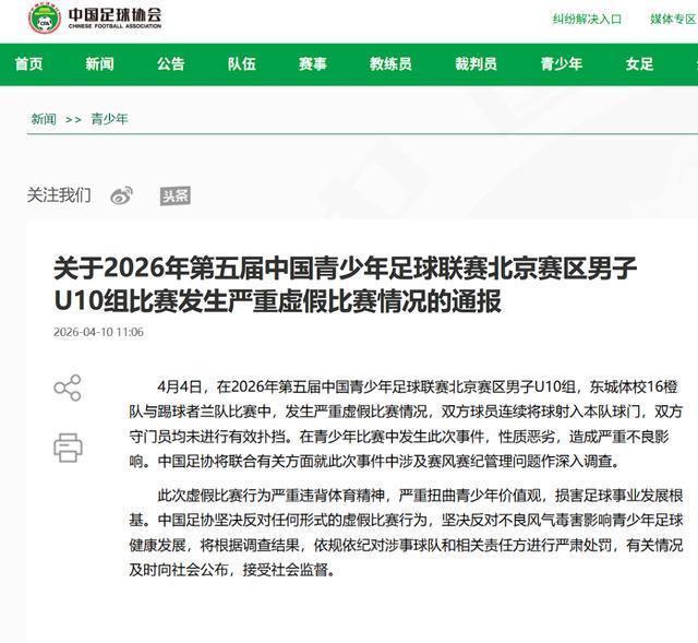 近日,2026年第五届中国青少年足球联赛北京赛区男子U10组赛事中,惊爆一起性质恶劣的虚假比赛事件。据相关通报,东城体校16橙队与踢球者兰队在比赛过程中,竟心照不宣地互相踢乌龙球,门将更是故意放水,这般行径实在荒唐至极,令人瞠目结舌。