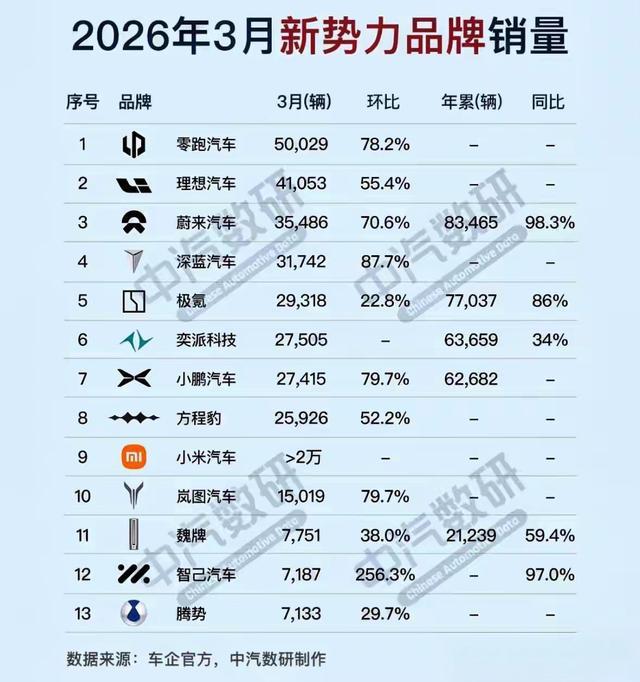让我们把目光聚焦到2026年3月的新势力销量榜。零跑以50029辆的优异成绩稳居榜首,展现出强大的市场竞争力;理想重回4万辆阵营,同比增速高达173%,发展势头迅猛;蔚来以35486辆跻身第三,同比涨幅达136%,表现同样可圈可点;极氪单月交付近3万辆,成绩斐然;就连后来者小米也成功突破2万辆大关。在传统车企的“创二代”阵营中,长安深蓝单月交付3.17万辆,东风奕派交付2.75万辆,岚图也达到了1.5万辆。相比之下,腾势的7133辆,在如今月销轻松破万已成为新势力“及格线”的大环境下,显得愈发形单影只,孤独无助。