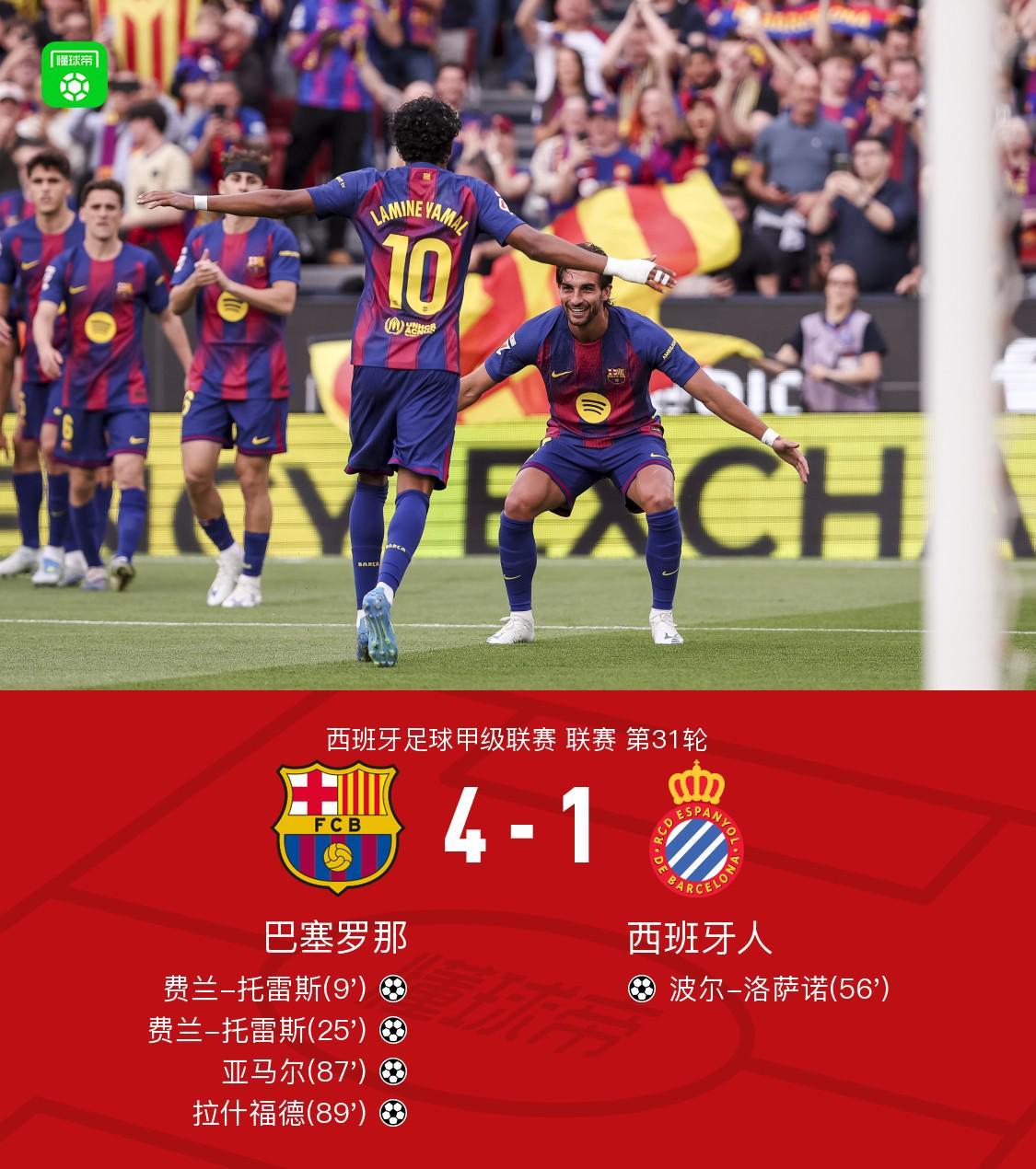 西甲焦点战|巴萨4-1完胜西班牙人,亚马尔两传一射主导胜局