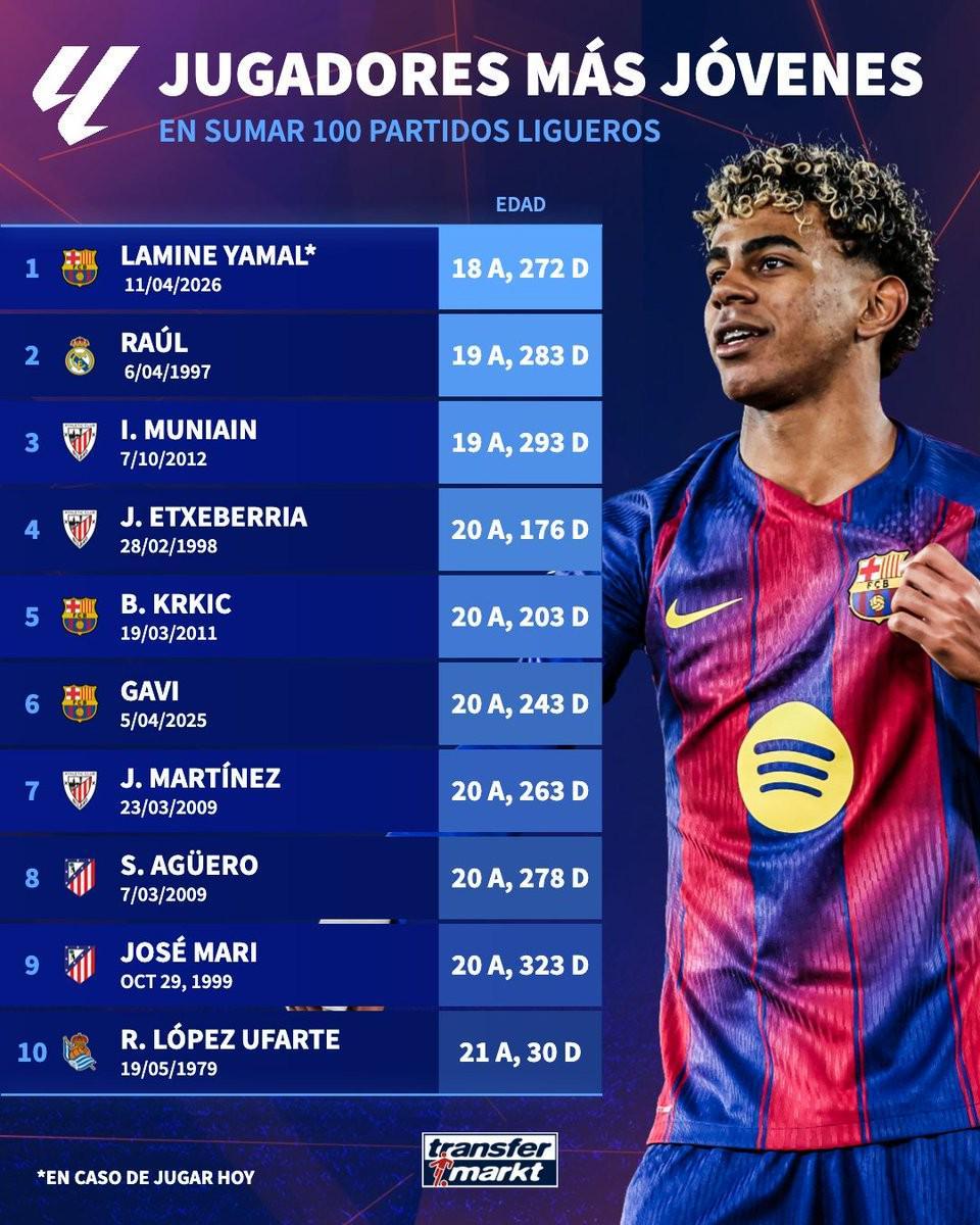 1. 亚马尔(巴塞罗那)——18岁272天(2026年4月11日),以惊人的速度崛起,成为巴萨乃至西甲的新希望。