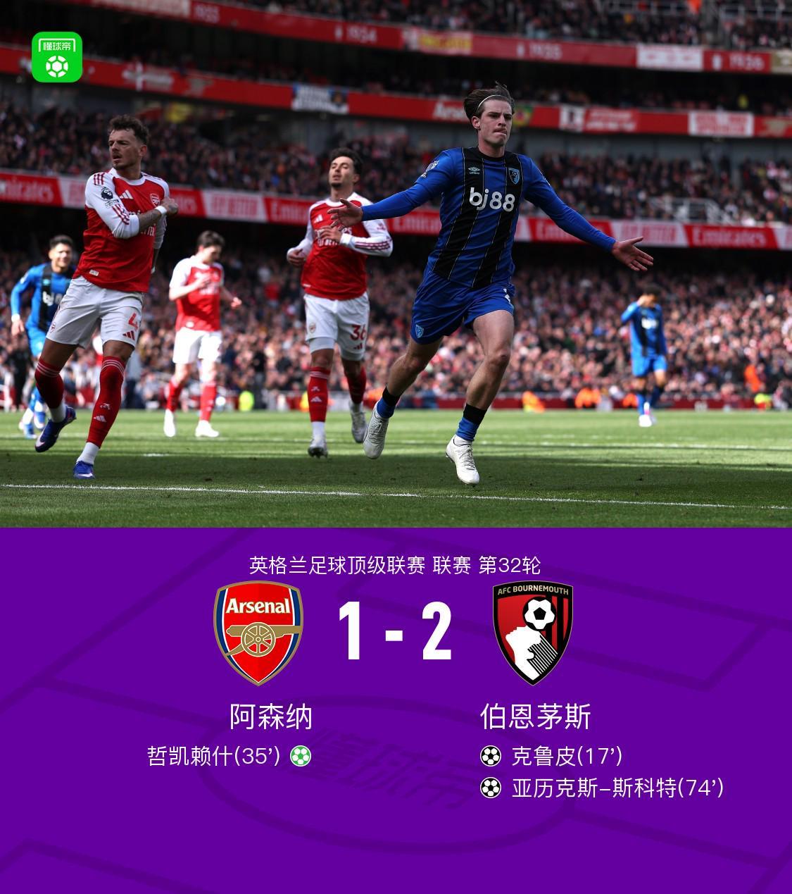 徽声在线丨阿森纳1-2不敌伯恩茅斯,哲凯赖什点射难救主,克鲁皮、斯科特建功