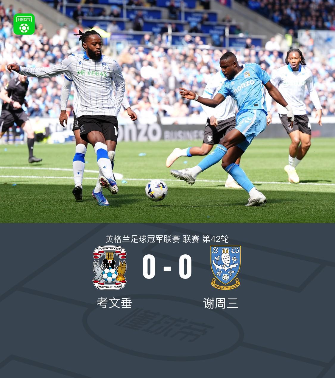 北京时间4月11日晚间,英格兰足球冠军联赛第42轮赛事迎来一场焦点对决,考文垂坐镇主场迎战谢周三。整场比赛双方攻防转换频繁,基钦在第19分钟曾有一次极具威胁的抢点头槌攻门,可惜被对方球员在门线前成功解围;而西姆斯与杰里-耶茨也分别错失了绝佳的破门良机。最终,经过90分钟的激战,双方以0-0的比分握手言和,考文垂遭遇两连平。
