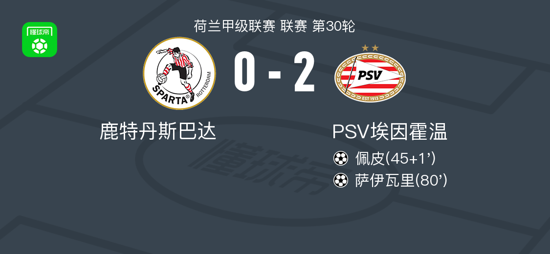 荷甲第30轮:PSV埃因霍温客场2-0完胜鹿特丹斯巴达,佩皮萨伊瓦里联袂建功