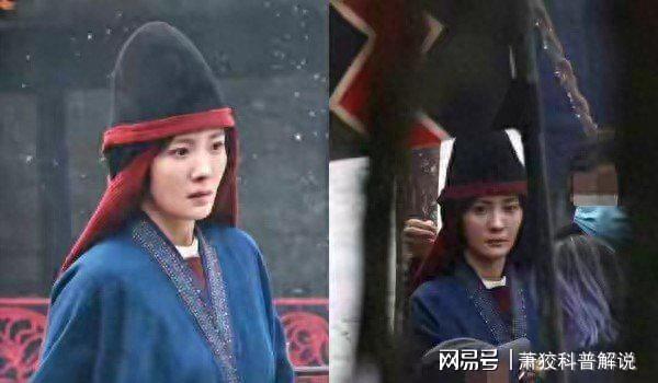 从曝光的路透照来看,杨幂身着一袭蓝色交领长袍,领口处绣着颇为精致的图案,整体给人一种古朴典雅的感觉。她头上戴的那顶帽子格外引人注目,黑色的圆锥形帽身,边缘滚着鲜艳的红边,帽子下方还用红布将耳朵包裹起来,造型十分独特。