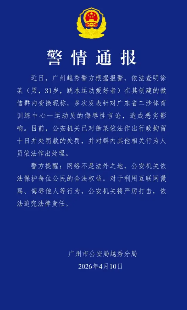 4月10日,全红婵遭遇网络暴力事件终于迎来了首张罚单,涉事群主徐某被处以行政拘留十日并罚款的处罚。