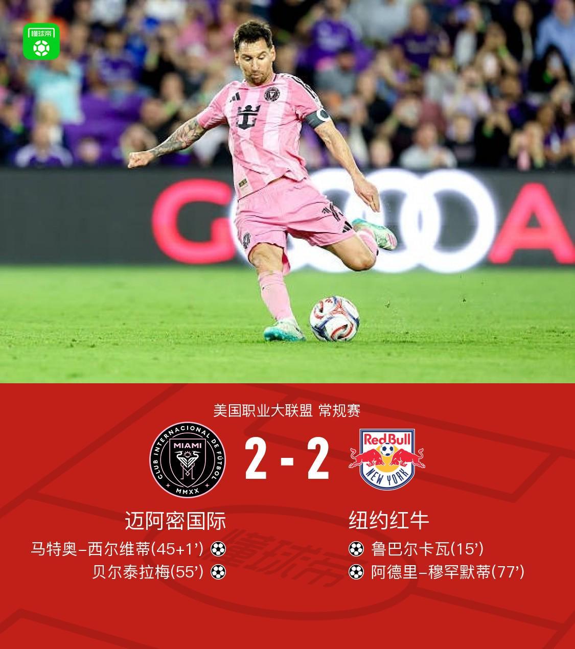 迈阿密国际2-2战平纽约红牛,西尔维蒂建功,贝尔泰拉梅绝杀球无效
