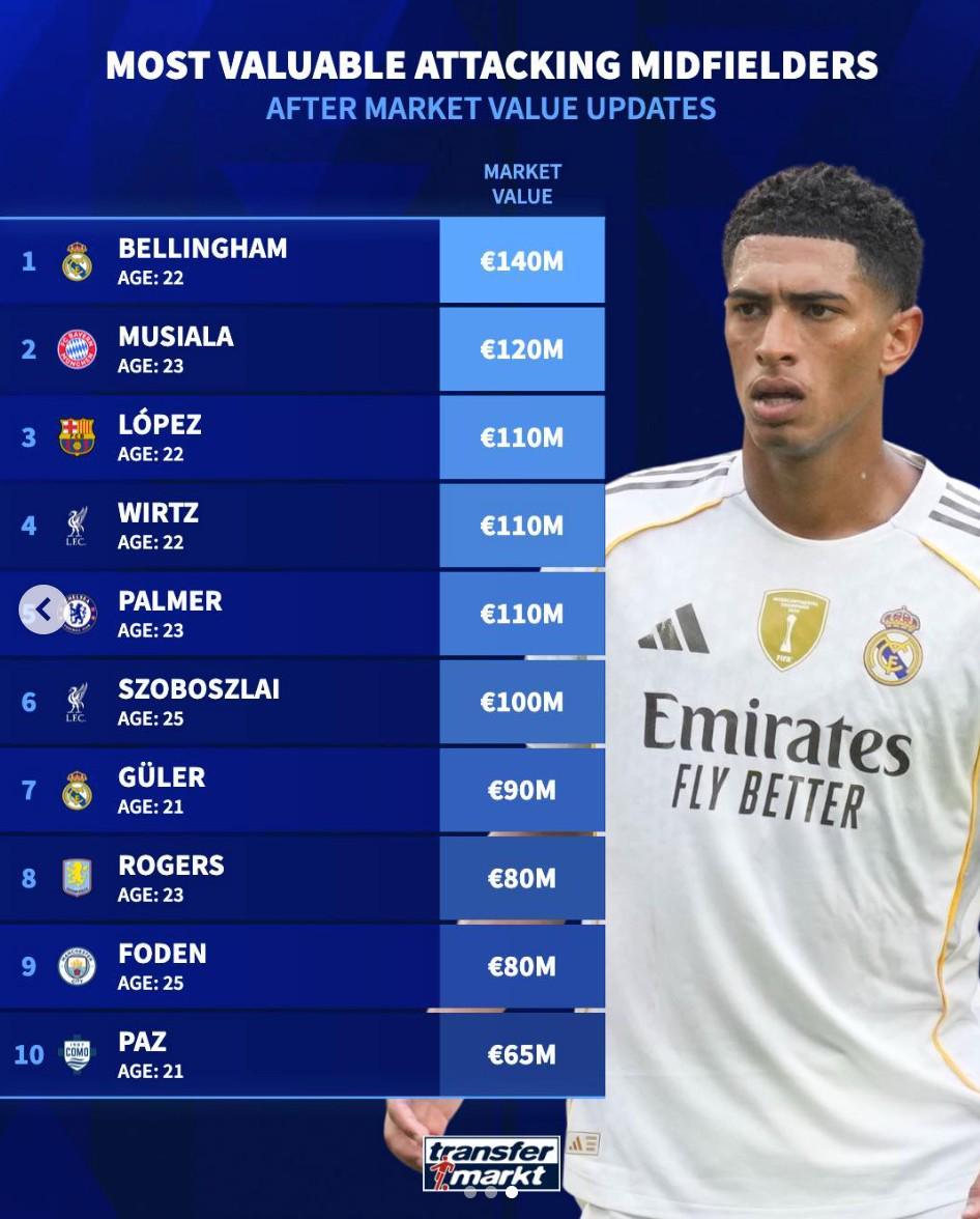 德转最新前腰身价榜:贝林厄姆1.4亿领跑,穆西亚拉紧随其后