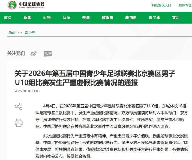 在2026年第五届中国青少年足球联赛北京赛区男子U10组的某场较量中,出现了一幕令人瞠目结舌的场景:双方球员竟相继向自家球门发起“进攻”,上演了一场荒诞的“互射乌龙”大戏。近日,北京足协已对涉事人员作出了相应处罚,而中国足协也迅速发布通报,表明将携手多方力量,对此事展开全面而深入的调查。
