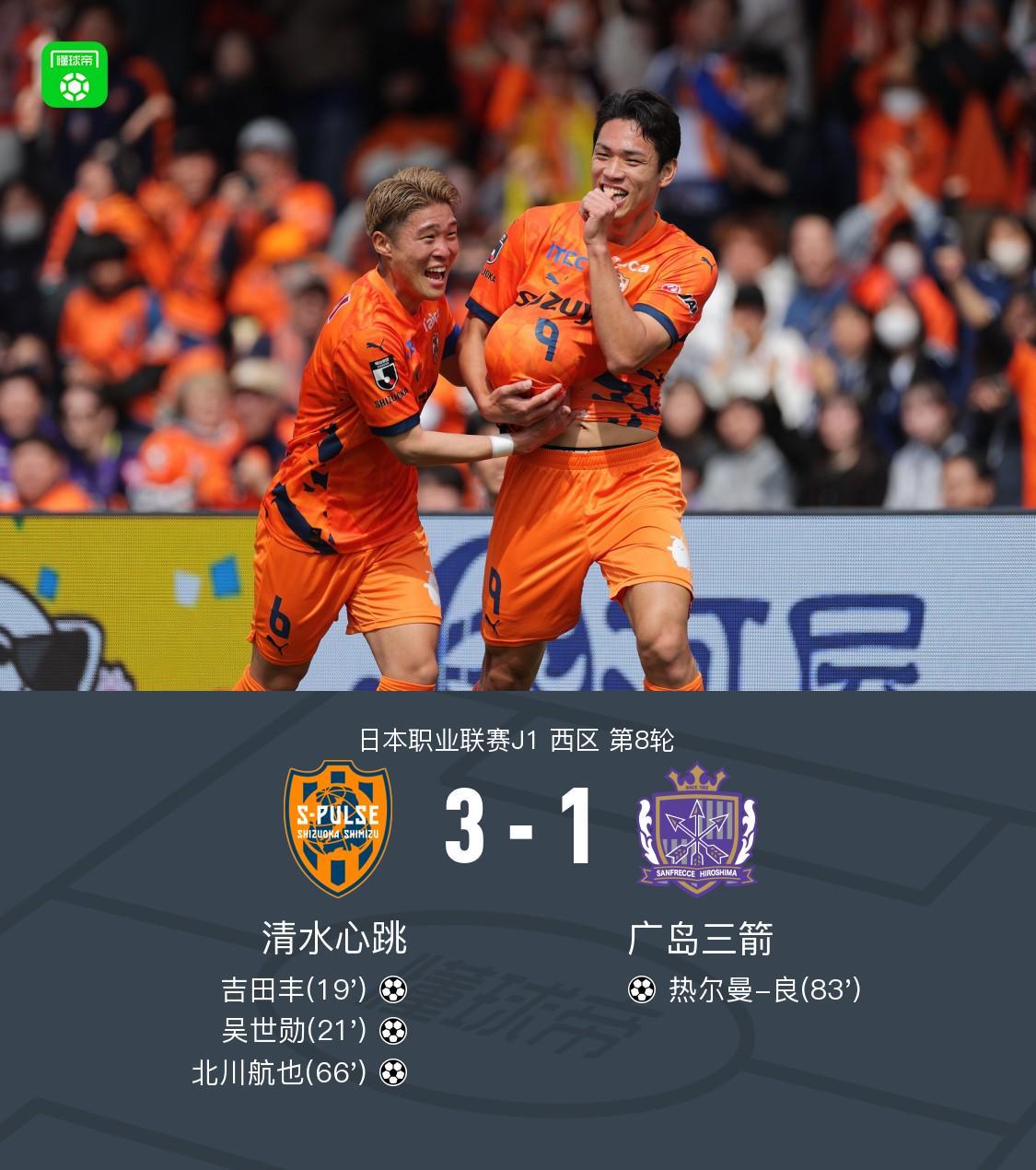 北京时间3月22日,日本职业联赛J1西区迎来第8轮焦点对决,清水心跳坐镇主场迎战广岛三箭。经过90分钟激战,清水心跳凭借吉田丰、吴世勋和北川航也的进球3-1力克对手,广岛三箭仅由热尔曼-良扳回一城。