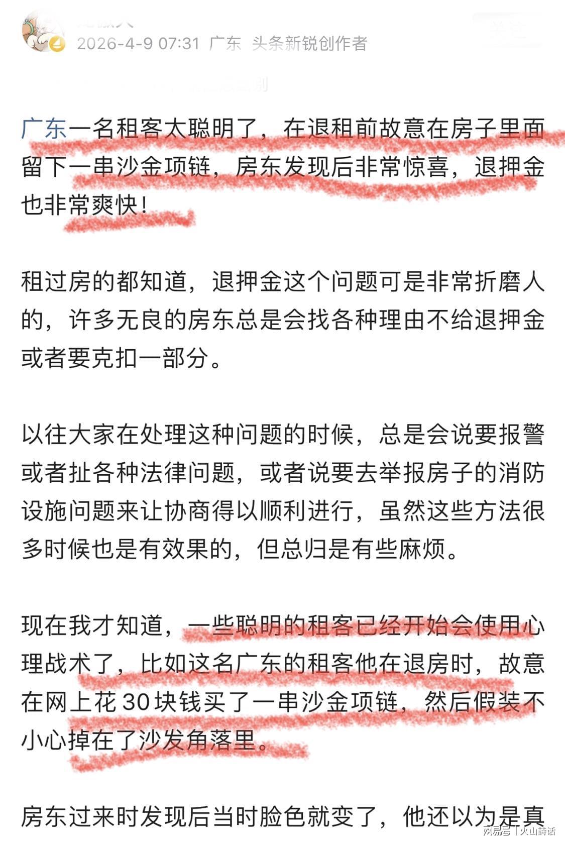 - 回到这则趣事,租客的这一看似滑稽的操作,实则精准地戳中了当前租房市场的痛点。通过一场小小的心理战术,折射出租客与房东之间普遍存在的信任危机和押金纠纷问题。