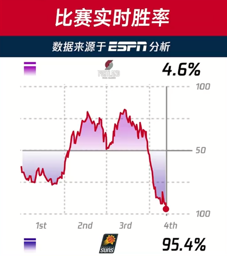 此时,转播方适时地公布了比赛的实时胜率数据。令人惊讶的是,ESPN给出的预测结果显示,开拓者队的胜率仅有4.6%,而太阳队的胜率则高达95.4%。这一预测并非空穴来风,赛前ESPN就并不看好开拓者队能够取胜。尽管在比赛的大部分时间里,开拓者队都保持着领先的优势,但到了第四节,太阳队突然发力,实现了全面反超。