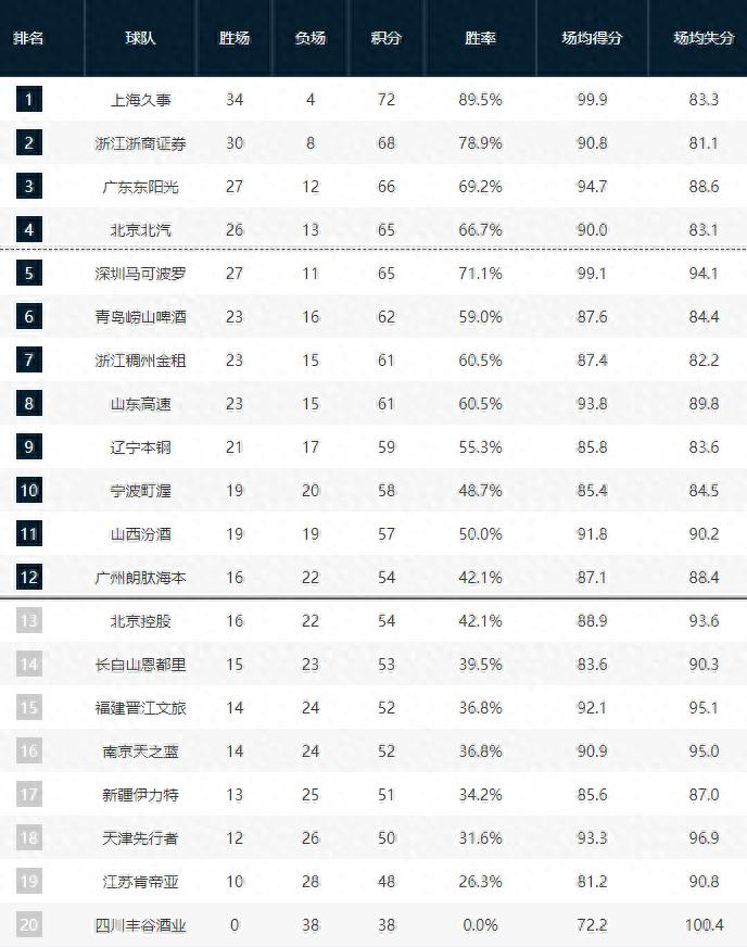 本轮比赛战罢,CBA积分榜再次更新。广东男篮与北京男篮均拿下了关键的胜利,广东队惊险过关守住了自己的排名,北京队则强势取胜巩固了自己的态势。可以预见,联赛后半程的竞争只会更加激烈,各支球队都将为了更好的排名而全力以赴,球迷们也将迎来更多精彩的比赛。