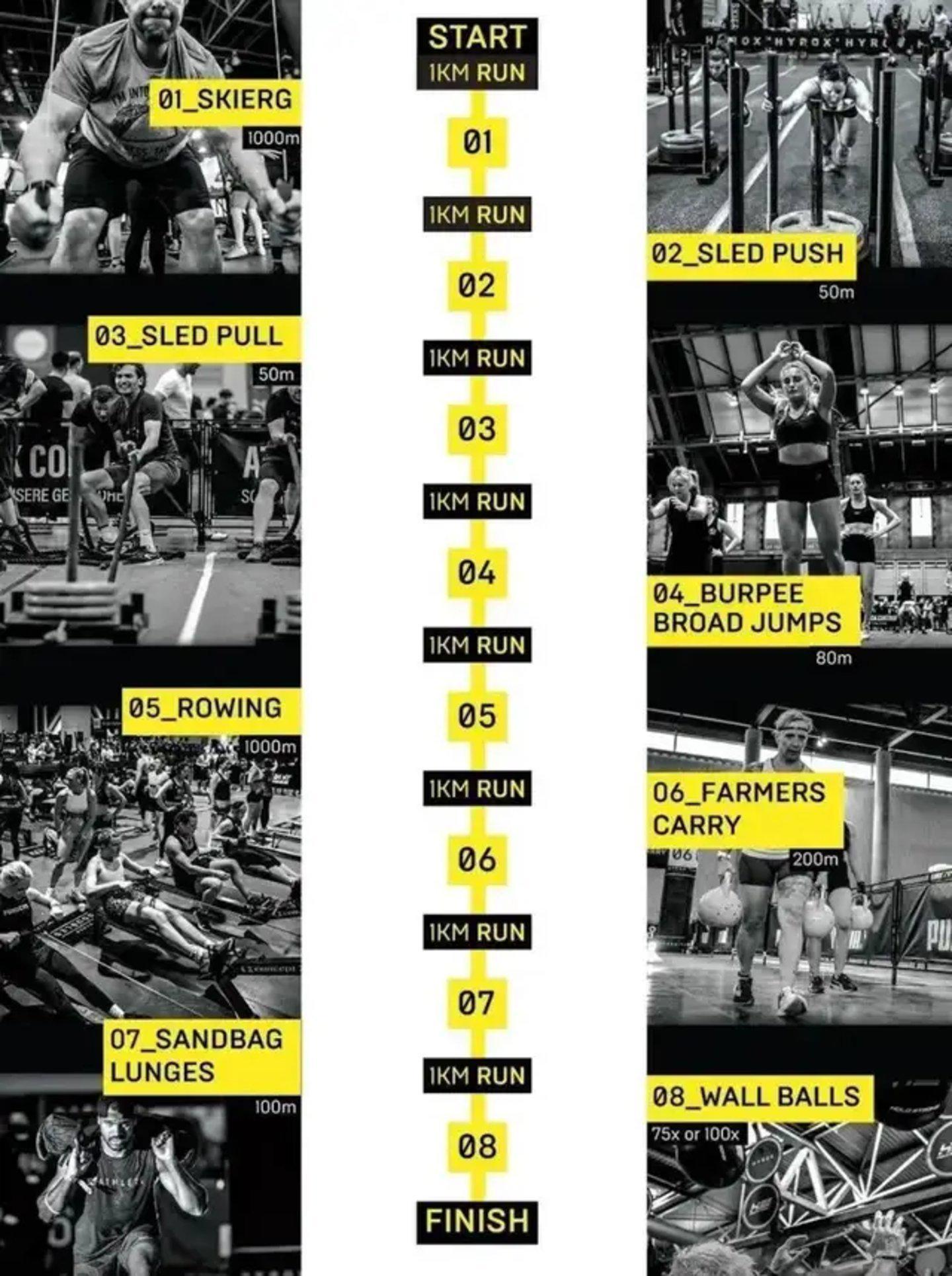 在这场循环挑战中,参赛者每完成一公里的奔跑,便需立即投入到一个体能项目中,如此循环往复八次,方能完赛。这些项目涵盖了滑雪机、划船机等有氧训练,以及推雪橇、拉雪橇、波比跳远、负重弓箭步等力量与协调性的综合考验。