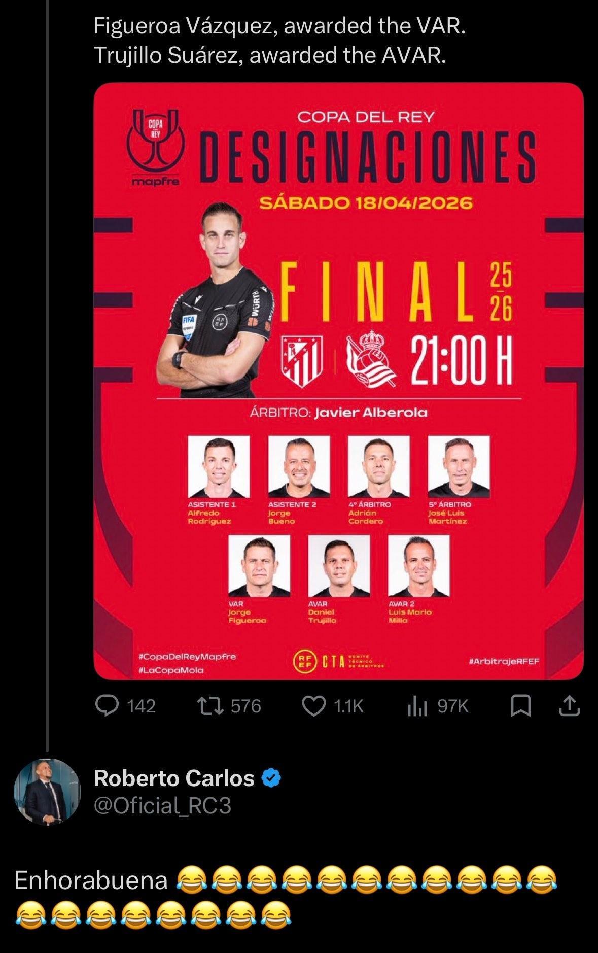 北京时间4月14日消息,皇家马德里传奇球星罗伯托·卡洛斯在个人社交平台发布动态,以一句意味深长的"恭喜啊"搭配三个笑哭表情,对西班牙足协任命阿尔贝罗拉·罗哈斯执法国王杯决赛的决定表达强烈质疑。这条动态迅速引发球迷热议,相关话题阅读量在2小时内突破50万次。