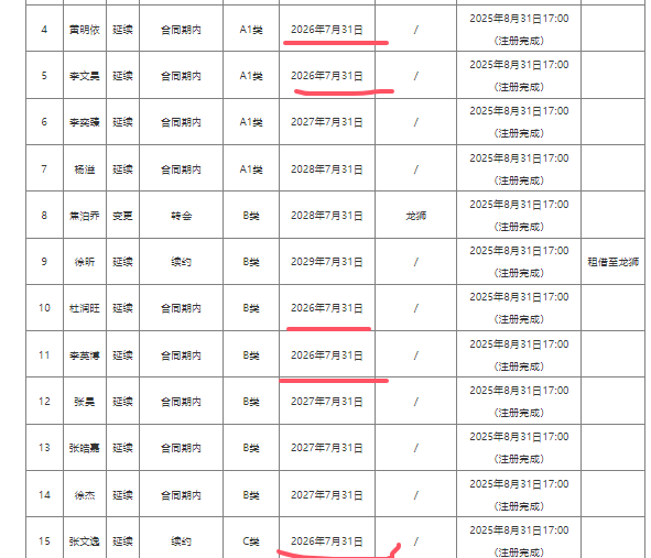 留队:萨姆纳、奎因、李英博(或以助教身份)、李文昊、杜润旺