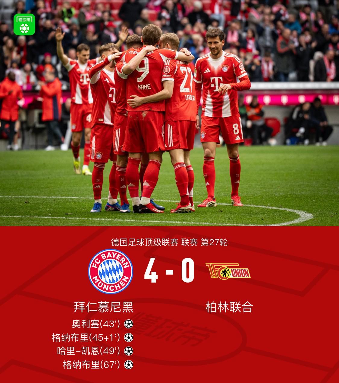 徽声在线|拜仁4-0横扫柏林联,格纳布里双响凯恩建功,奥利塞首开纪录