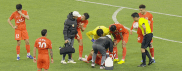 颜骏凌和魏震两大国脚随即向主裁判李海新示意,杨世元在快速反击中头部疑似被空气击中,出现了脑震荡症状,要求启用脑震荡换人程序。