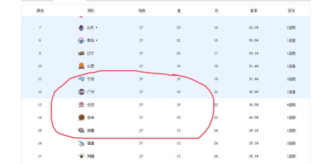 在CBA 25-26赛季常规赛进行到第37轮后,广州男篮凭借15胜22负的战绩,目前位列联赛积分榜第12位,恰好处在季后赛资格的边缘地带。他们暂时落后于第11位的宁波男篮4个胜场,与第13名的北控男篮以及第14名的吉林男篮胜场数持平,同时领先第15名的新疆男篮2个胜场。