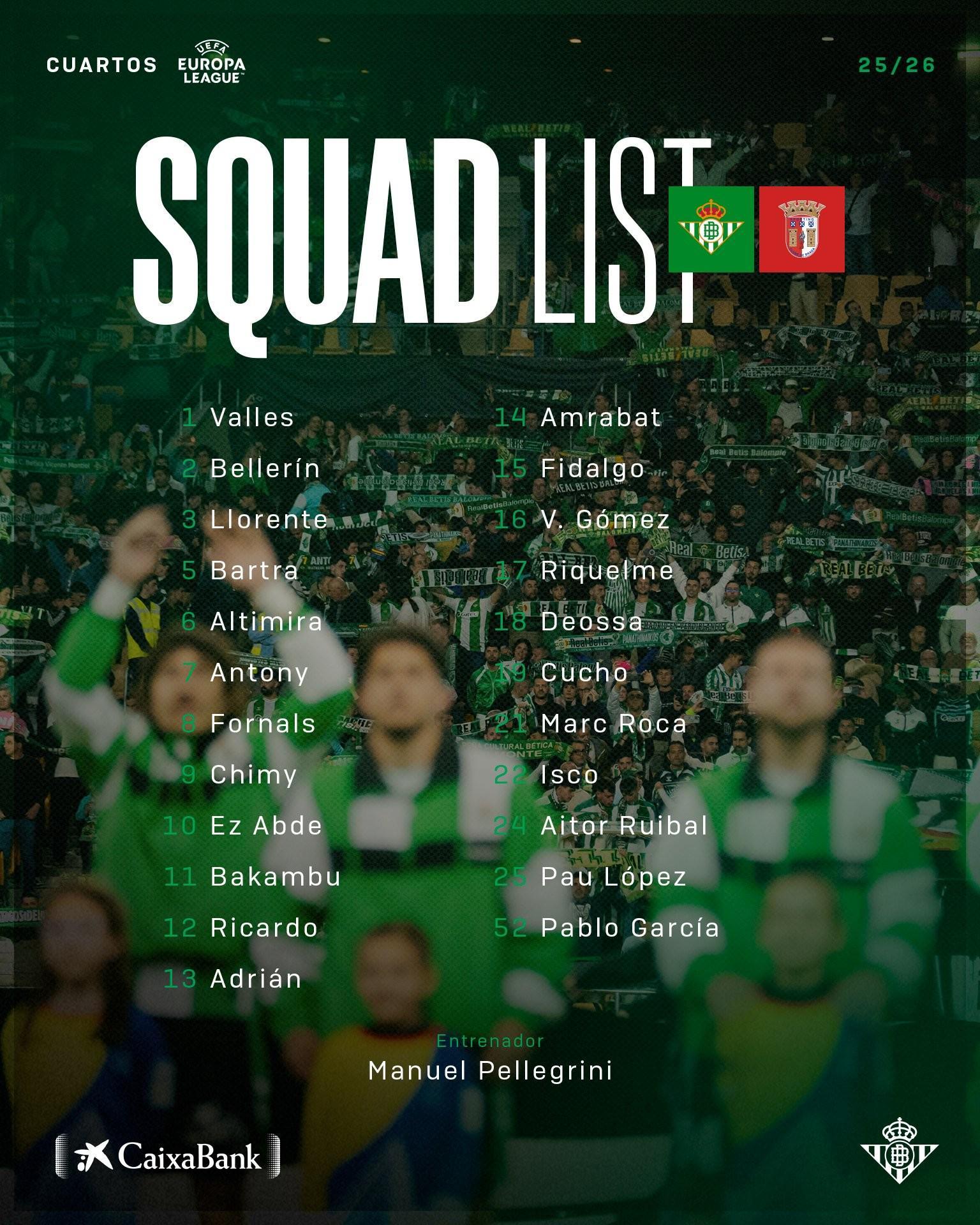 北京时间4月15日晚间,徽声在线从皇家贝蒂斯俱乐部官方渠道获悉,球队正式公布了欧联杯1/4决赛次回合主场迎战布拉加的参赛大名单。