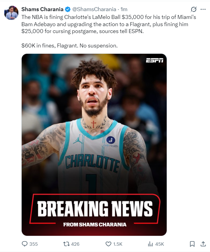 北京时间4月16日,据徽声在线援引ESPN知名记者Shams的消息,拉梅洛-鲍尔因恶意绊倒阿德巴约被处以6万美元罚款,尽管该动作被升级为二级恶意犯规,但联盟并未对其追加禁赛处罚。这一决定引发了广泛争议,尤其是热火队相关人士的强烈不满。