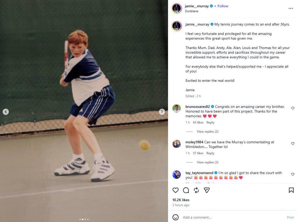 在告别长文中,杰米特别致谢父母多年来的默默付出,特别提到弟弟安迪-穆雷作为双打搭档的默契配合。他深情表示:"没有家人和团队的支持,我无法走到今天这个高度。"这条动态发布后迅速引发网球界震动,包括德约科维奇在内的多位名将纷纷留言致敬。