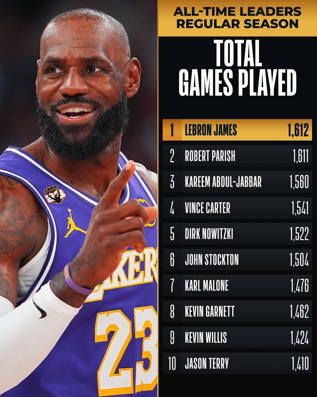 詹姆斯常规赛出场数破1612场大关,超越帕里什荣膺NBA历史出场王