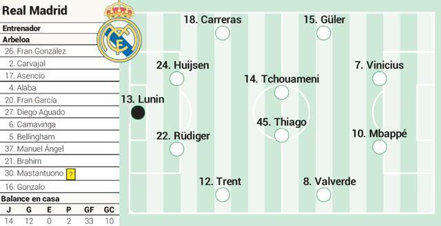 皇马预计首发十一人阵容如下: 卢宁担任门将;后防线上从左到右依次是卡雷拉斯、怀森、吕迪格和特伦特;中场四人组为居莱尔、楚阿梅尼、蒂亚戈和巴尔韦德;锋线上则是姆巴佩和维尼修斯的搭档。