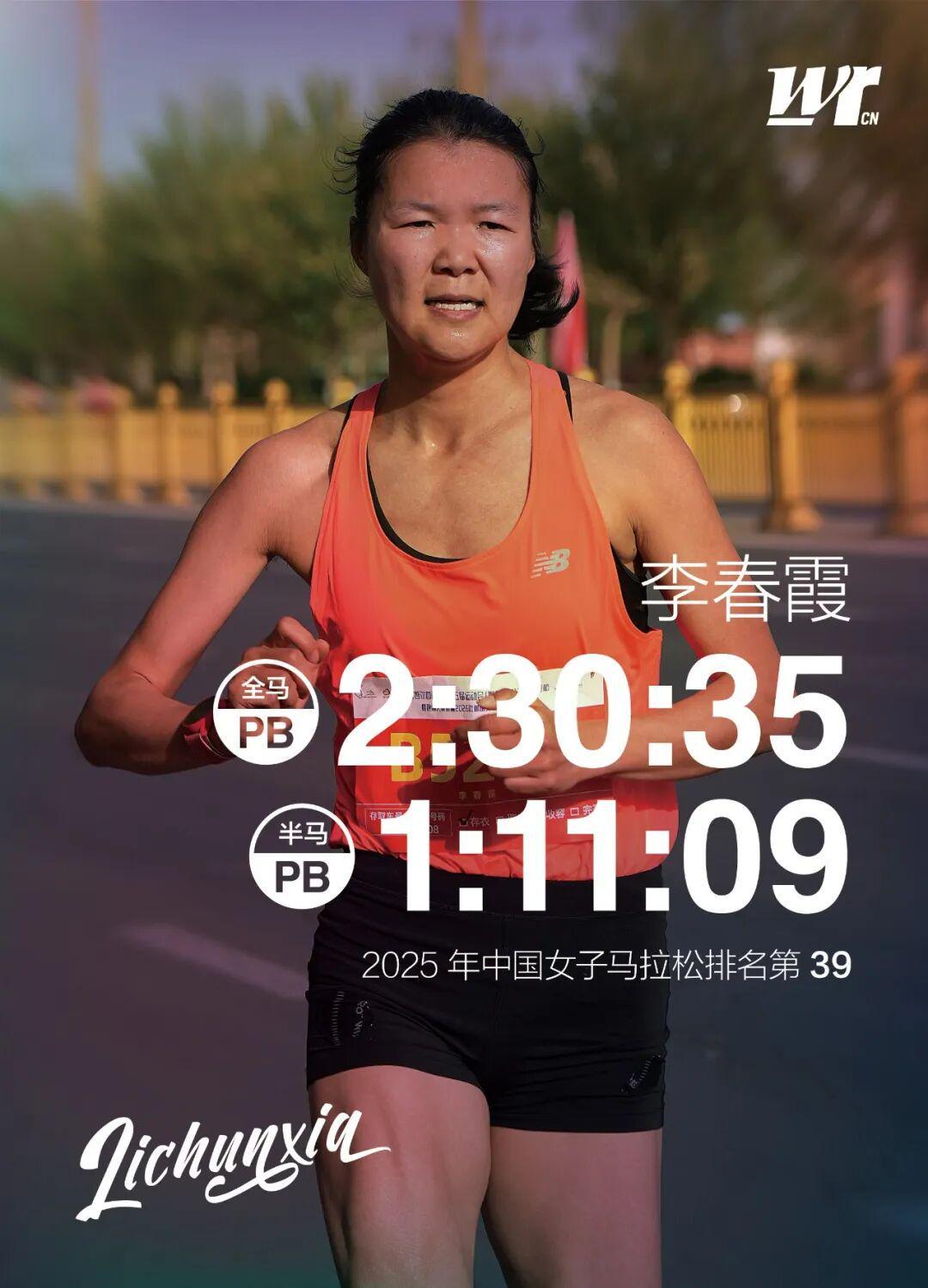 2026年,吐鲁番半马亚军,成绩1:15:46;同年,武汉马拉松全马国内女子亚军,成绩2:34:16;重庆女子半马季军,成绩1:17:02。再往前追溯,2024年,她以2:30:35的成绩位列上半年中国女子马拉松百强榜第11名。