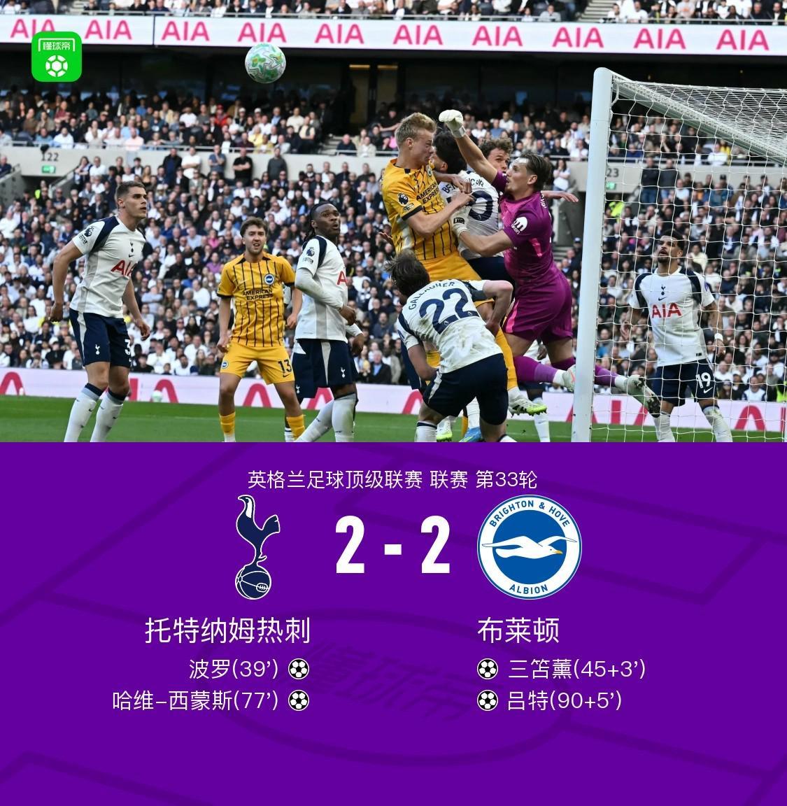 剑南春|热刺2-2布莱顿难求一胜,西蒙斯传射建功,吕特补时绝平